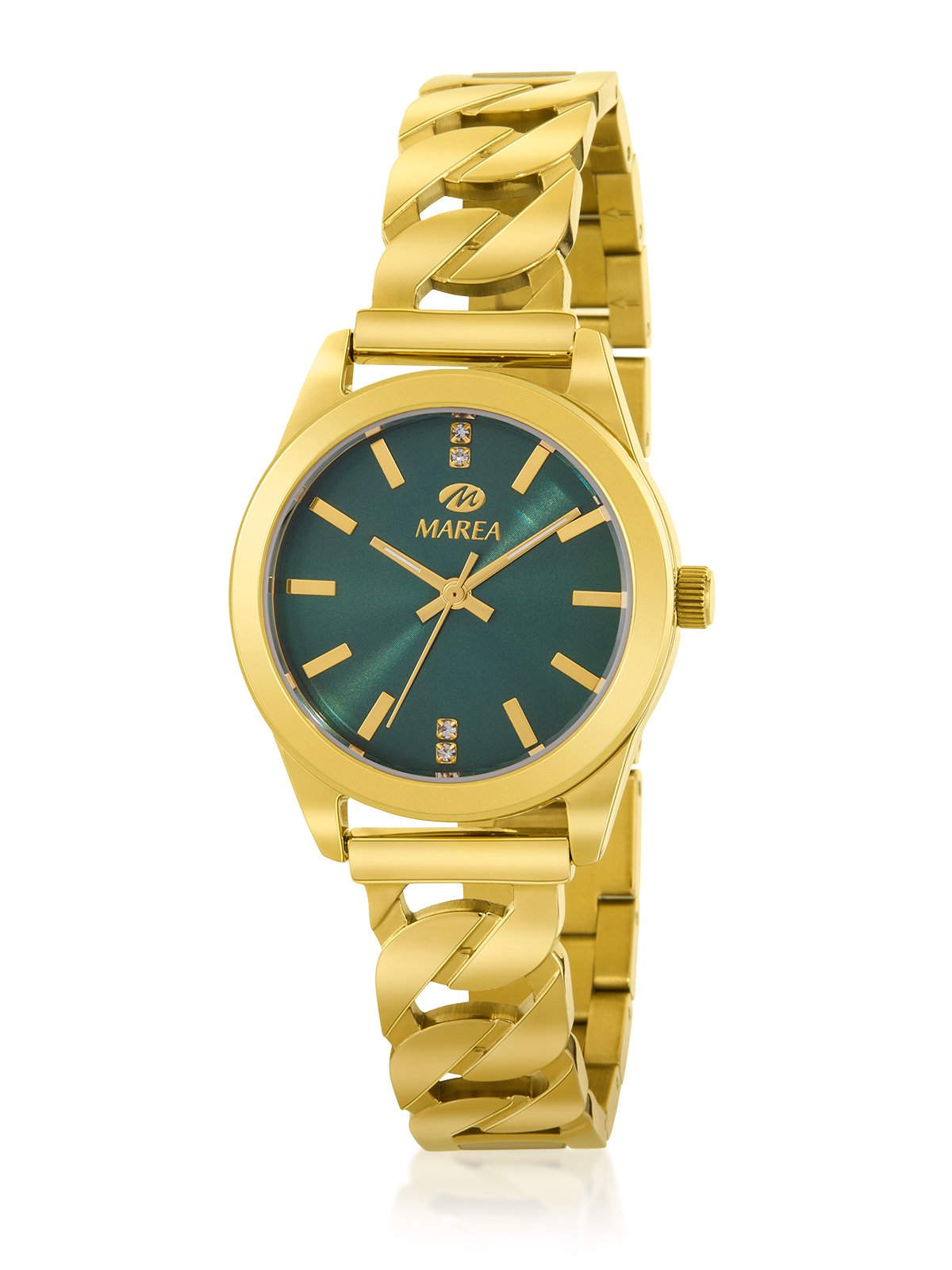 Material Caja: Metal color dorado con tapa y corona de acero.