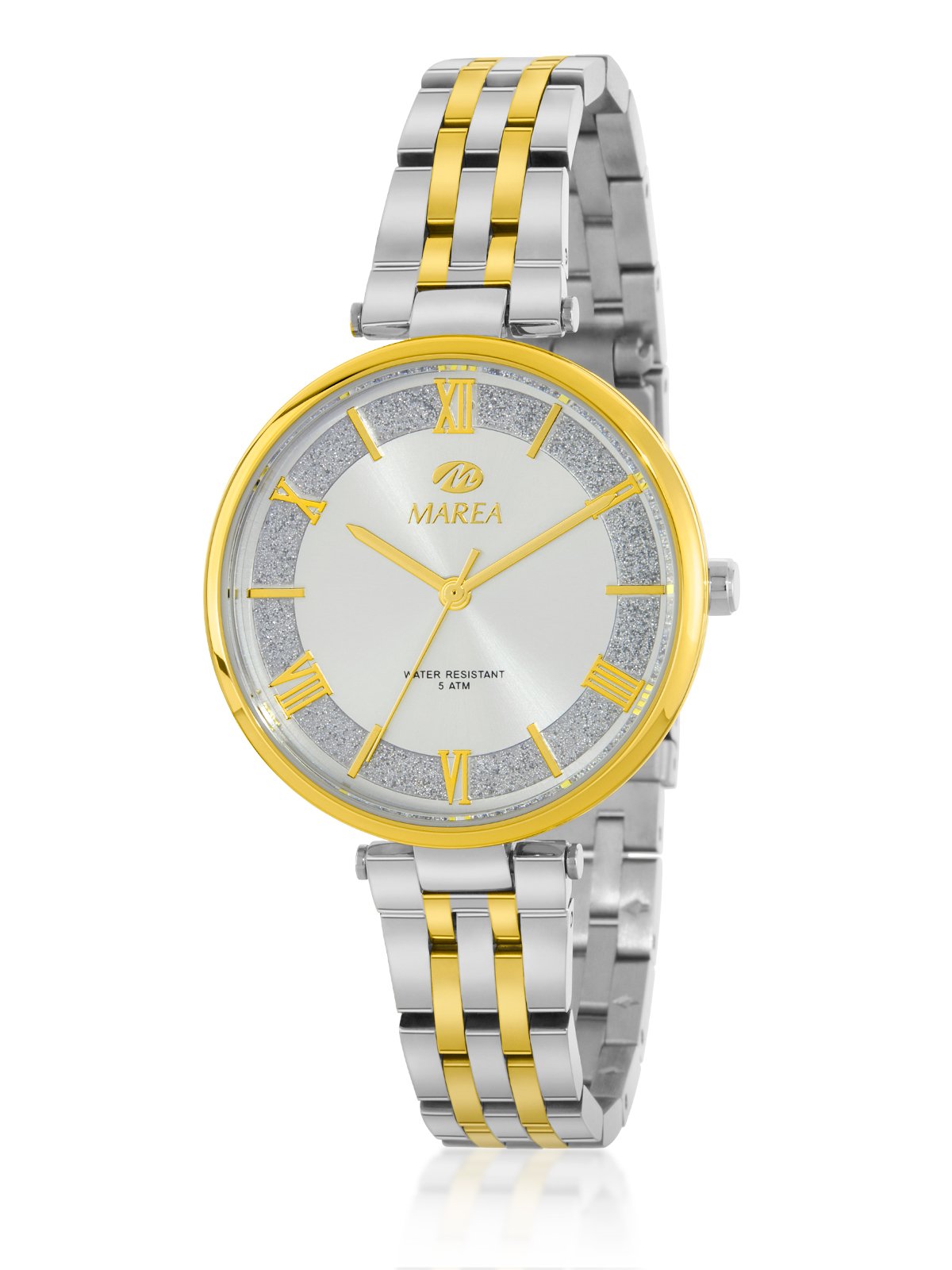 Esfera: Color plateado con detalle de purpurina y agujas e índices en color dorado.